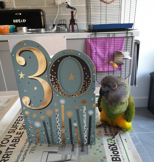I'd like to tell you about our Jake, a Senegal Parrot! He's our amazing little boy and today (April 11th) is his 30th Hatchday.