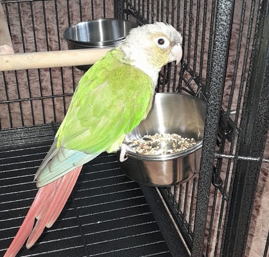 Kiwi is 10 years old and got from a breeder. He loves red peppers and pomegranate and red paper cups. Also he loves his water fountain bird bath. He says hi baby and his favourite noise is a loud screech.
